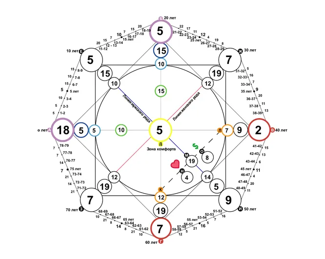 Цифры, образующиеся вокруг Матрицы – это значения периода. Те энергии, которые мы будем проживать и отрабатывать в том или ином возрасте.