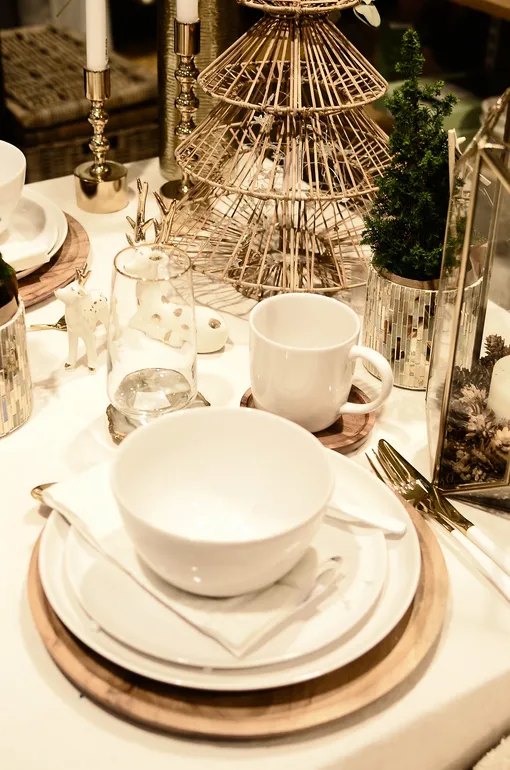 Для оформления подойдет бело-золотая гамма. На столе обязательно должны лежать скатерть из натуральной ткани, текстильные салфетки, стоять свечи с золотистыми или серебристыми лентами.