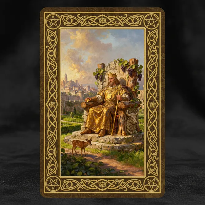 На карте Таро Король Пентаклей изображен молодой мужчина с крупным пентаклем в руке. Он восседает на троне, украшенном виноградной лозой. Благодаря своим амбициям и решимости герой достиг материального благополучия. Он уверен в себе и ничего не боится.
